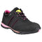 Women's modern lightweight safety trainer crafted with Nubuck Leather, PU padded collar, anti-static and durable full Rubber outsole. Available in sizes 3 to 9.